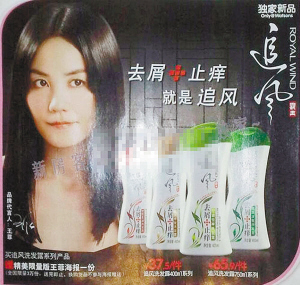 該網(wǎng)友上傳的照片中,王菲清湯掛面的造型與她特立獨(dú)行的性格相當(dāng)不符,而天后似笑非笑的表情,也并不討好消費(fèi)者。當(dāng)然,與王菲頭像并列的“追風(fēng)”牌洗發(fā)水,更被網(wǎng)友大批好似山寨貨,該品牌洗發(fā)水打出的功效是“去屑止癢”,并在海報上注明凡是購買產(chǎn)品寄送王菲海報一張,全國限量3萬張。