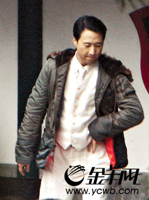 為免造型曝光,劇組人員相當(dāng)小心,所有有可能被拍攝到的位置都以布幕封好。但百密一疏,在畫舫齋旁邊長廊盡頭,記者守候了一會,突然看見一名身穿白色西裝加軍綠色外套的男子出現(xiàn),原來正是穿上戲服的黎明。