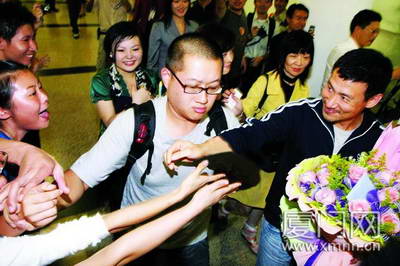 昨天下午,本次友迷“高考”的狀元唐艷艷也加入了機(jī)場的“友迷”大軍。她告訴記者,自己是晚報娛雯子的鐵桿“粉絲”,經(jīng)常在雯子博客上發(fā)表評論。見到這份“高考”試卷后,從小聽張學(xué)友的歌長大的她便第一時間參加了答題,沒想到居然拔得頭籌!霸嚲砩系念}目非常有意思,一看就會被吸引住”,她直夸出題的人“太有才了”,居然連張學(xué)友所扮演過角色的武功高低都能弄清楚。唐小姐獲得了張學(xué)友廈門演唱會的門票,幸福得“暈乎乎的”。而之后在親眼見到學(xué)友哥本人后,她“更暈了”。(記者 龔小莞)