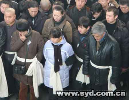 告別儀式最后,是趙德仁家人向遺體告別。老趙帶領著家人面向遺體一字站定,跪倒,三叩首。隨著司儀 宣布“封棺”,家屬紛紛搶上前去,失聲痛哭。“爺爺—”趙德仁老人的幾個孫子呼喚著老人,趙本山也轉過臉去……