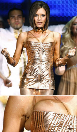 33歲的維多利亞穿上Roberto Cavalli金色緊身裝非常搶眼,可是也因?yàn)樘o,在托高胸部時(shí),右邊腋下竟驚現(xiàn)離奇贅肉。之前據(jù)傳,維多利亞在此次巡回演唱會(huì)前,因?yàn)榕滦夭刻罂赡懿簧骶痛汗馔庑埂⒂绊懕硌,所以特別將胸部填充物取出。不過(guò)也有消息稱,維多利亞再度有喜,害怕隆胸填充物對(duì)胎兒有害,才將其取掉。
