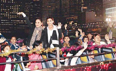 中新網(wǎng)12月17日電 愛心爆棚的Twins前晚專程抽空和一群小朋友坐敞篷公交車,夜游鬧市預(yù)祝圣誕節(jié)。今年蔡卓妍(阿Sa)和鐘欣桐(阿嬌)將在工作中過節(jié),阿Sa希望有機(jī)會(huì)到泰國穿泳衣過一個(gè)熱辣辣的圣誕!