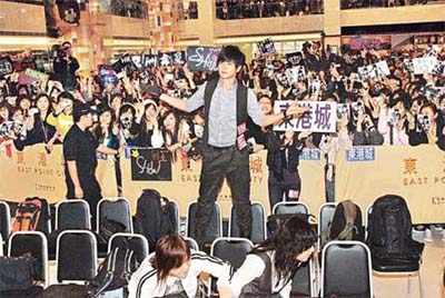 中新網(wǎng)12月27日電 羅志祥(小豬)昨午由臺灣抵港,出席下午在將軍澳新都城商場舉行的簽唱會,約三十名“粉絲”接機(jī),雖然步出機(jī)場時(shí)面露疲態(tài),但出席簽唱會時(shí),小豬馬上又充足電,且十分親民,跟Fans抱抱之余,大合照時(shí)還舉起Fans自制的牌合照,還輕觸Fans玉手,逗得全場瘋狂大叫。簽唱會吸引近千人圍觀,場面熱鬧!