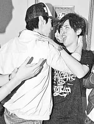 羅志祥(小豬)早前在博客上以“女友”稱呼吳尊(尊美人),還上傳兩人的親密照,一度令歌迷浮想聯(lián)翩。前晚在偶像劇《籃球火》的殺青儀式上,小豬與吳尊被要求當眾“接吻”,只見小豬作勢捧尊美人的俊臉來親,吳尊想避開也不能,上演一幕火辣辣的激吻,不過事后吳尊強調(diào)沒被小豬親到。當晚雖然言承旭因病臨陣缺席,但其他演員依然玩得情緒高漲,小豬與吳尊的“斷背吻”,當然是全晚焦點。