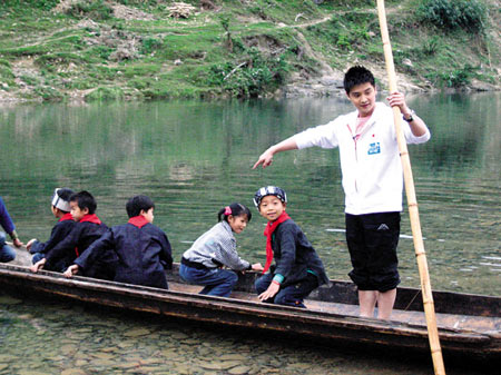 田亮一大早就跟隨節(jié)目組來(lái)到大山深處的巖撈小學(xué),該校學(xué)生大部分都是苗族和水族,原來(lái)的校舍去年被山洪摧毀了,如今的臨時(shí)教室建在半山腰,只是用編織袋簡(jiǎn)單當(dāng)墻壁圍起來(lái)的吊腳樓。學(xué)校和寨子中間有一條小河隔開(kāi),孩子們每天上學(xué)都是靠一葉小舟擺渡過(guò)河。田亮自告奮勇要當(dāng)一回“艄公”,沒(méi)想到在城里長(zhǎng)大的他撐起船來(lái)居然也得心應(yīng)手。而到了上體育課的時(shí)候,田亮更是盡顯專業(yè)素質(zhì),先帶領(lǐng)大家做熱身運(yùn)動(dòng),然后設(shè)計(jì)了足球、跳繩、平衡木、越野接力賽等科目,內(nèi)容豐富多彩。