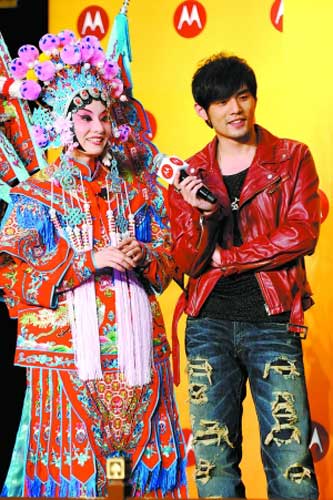 由周杰倫代言的摩托羅拉推出新款手機(jī),不僅請(qǐng)到周杰倫,而且還邀請(qǐng)了京劇演員、變臉演員等進(jìn)行表演。其中一名扮演“穆桂英”的女演員表示自己是周杰倫的“粉絲”,而周杰倫也饒有興趣的向這位京劇演員學(xué)唱“穆桂英掛帥”當(dāng)中的經(jīng)典選段,還表示想借“穆桂英”的行頭來穿穿。最后,周杰倫和“穆桂英”不僅共同演唱了改了詞的京劇,還一起用京劇的唱法合唱了周杰倫的名曲《千里之外》。對(duì)京劇流露出濃厚興趣的周杰倫聲稱:“我考慮在我的演唱會(huì)中加入京劇的元素。要是上萬人一起合唱京劇,實(shí)在是很酷。”
