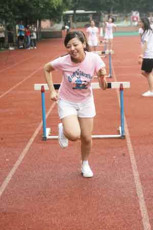 而接下來的跨欄更是讓人笑彎了腰,除了大牙和小蠻這兩個(gè)身高腿長(zhǎng)的美眉能一跨而過,其他人都是慢吞吞地“走欄”——一腳跨過去,站定后另一腳才跨,特別是MeiMei,跑步的笨拙姿勢(shì)讓大家大笑不已。而到跳高時(shí),鬼鬼幾乎是連攀帶爬,姿勢(shì)十分狼狽,難得她躍過后還露出自信的微笑。而筱婕、小蠻和Apple都是雙手?jǐn)偲,企圖正面跳過去,可是每次都落得個(gè)肚子壓住橫竿的結(jié)局,被黑人揶揄為“狗爬式!