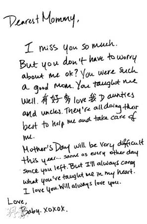 無法要求肥姐再做“母親節(jié)”專訪,所以《明報(bào)》轉(zhuǎn)托欣宜把肥姐的愛延續(xù)下去,記者寫到,當(dāng)欣宜靜靜地在寫給媽咪的信時(shí),我看她的眼淚一直在流,心里真的好痛,就因一個(gè)病,把一對(duì)相依為命的母女永遠(yuǎn)分開了,欣宜就要一個(gè)人地走下去,看到她這封信寫著“親愛的媽咪,我好掛念你,但你不用掛心我,你是一位好母親,教導(dǎo)我好好成長(zhǎng),有好多愛我的姨姨與叔叔,他們都盡心盡力照顧我。今年的母親節(jié)對(duì)我來說非常之不同,就如你已離開我的每一天一樣,不過我永遠(yuǎn)都記得你教我的一切,你永遠(yuǎn)都在我心里面。我愛你!一直一直的愛你!Baby(肥姐對(duì)欣宜的昵稱)”