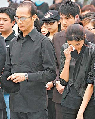 鄭少秋(左)為尊重死難者除去帽子,在旁的蒙嘉慧不停用紙巾拭淚。