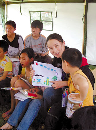 蔣勤勤跟隨全國婦聯(lián)“母愛在行動”小組奔赴四川重災(zāi)區(qū)綿陽,已經(jīng)身為人母的她得知地震之后,首先想到的就是災(zāi)區(qū)的兒童,當?shù)弥獮?zāi)區(qū)緊缺奶粉等嬰兒食品時,她特意帶去了價值10萬元的奶粉和牛奶。在災(zāi)區(qū)的幾天走訪,蔣勤勤主要探訪了災(zāi)區(qū)懷孕的準媽媽和失去雙親的孤兒。蔣勤勤透露,災(zāi)區(qū)目前急缺的除了帳篷和藥品,許多生活必需品也非常匱乏,她此行就了解到,災(zāi)區(qū)就急需各種女性生理用品。
