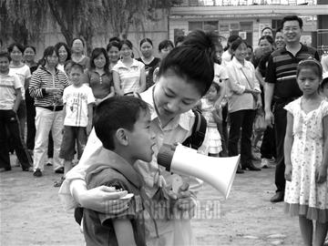 6月1日一早,央視節(jié)目主持人王小丫出現(xiàn)在地震災(zāi)區(qū)彭州市慶興小學(xué)的操場(chǎng)上,與災(zāi)區(qū)孩子們一起慶祝“六一兒童節(jié)”的畫(huà)面。王小丫胸前戴著一張“有希望就有未來(lái)”的愛(ài)心卡,教災(zāi)區(qū)孩子們畫(huà)笑臉,和孩子們疊紙飛機(jī)、唱歌、做游戲,還給孩子們做心理輔導(dǎo)。