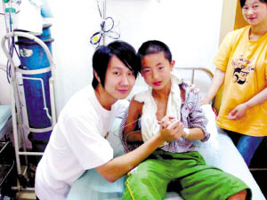 日前林俊杰推卻一切宣傳工作,專程飛抵成都兒童醫(yī)院探望災(zāi)區(qū)重病兒童,并送上禮物給孩子們。在醫(yī)院的ICU病房,林俊杰(見左圖,與受傷小朋友在一起)看望了傷勢(shì)較重的王敏和李斯隱,正巧兩人都是林俊杰的超級(jí)粉絲。王敏向偶像提出了自己的兒童節(jié)禮物,“能不能為我唱一首《期待愛》?”她靦腆地問道。林俊杰當(dāng)即滿足了孩子的要求,輕聲地唱了起來(lái),病房里頓時(shí)充滿了喜悅,受傷的王敏露出了災(zāi)難后的第一次笑容,接下來(lái)的病房也變成了小型演唱會(huì)的現(xiàn)場(chǎng),林俊杰與孩子們合唱了很多歌曲。林俊杰表示,希望用自己捐獻(xiàn)的善款建一所希望小學(xué)。