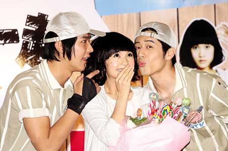 在新劇中飾演“宅女”的楊丞琳表示,她是首次飾演這樣內(nèi)斂的角色,也是一種挑戰(zhàn)。劇中,她將與飾演偶像明星的汪東城以及飾演青梅竹馬好友的胡宇崴有一段錯綜復雜的三角戀情。問到楊丞琳對兩個男生有什么印象,無厘頭的她竟回答:“我覺得他們一直在對我用力。”她透露,第一次見到大東時,她主動找他攀談,他卻一臉酷樣不理人。對此沒印象的大東連忙澄清:“可能是我在團里被要求?,不能講話吧!贝髺|說他媽媽很欣賞楊丞琳:“我跟她同樣都是一出道就要幫家里背債,她已還完債并買了新房子,現(xiàn)在我的房貸也快還清了,正在找新房子!睏钬┝章犕犟R上說:“我家那邊還有空屋,歡迎來當我的鄰居!