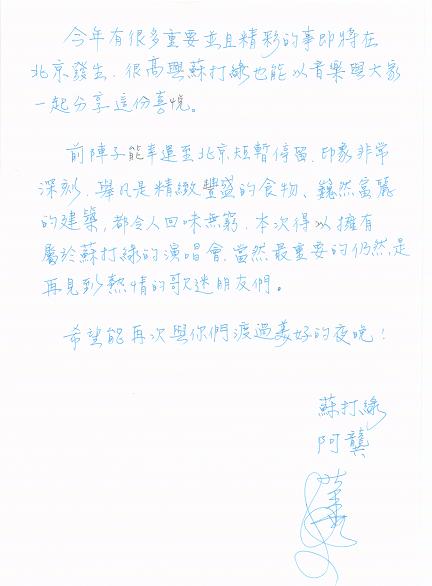 中新網(wǎng)6月10日電 隨著6月15日“陪我唱歌”蘇打綠北京演唱會(huì)的日益臨近,全國的歌迷翹首以待臺(tái)灣第一樂團(tuán)蘇打綠的到來,演唱會(huì)的門票的銷售情況也是非常的火爆。近日,遠(yuǎn)在臺(tái)灣的蘇打綠樂團(tuán),親自手寫信函來表達(dá)對(duì)歌迷此次演唱會(huì)的支持與厚愛,同時(shí)也表達(dá)對(duì)此次北京之行的急切與喜悅之情。