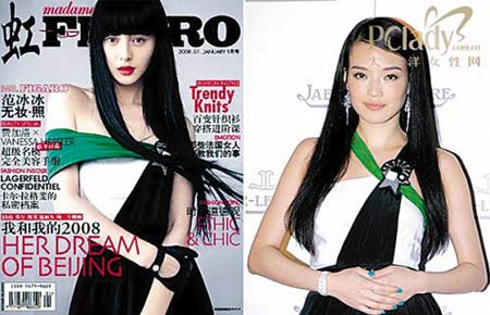 生活中,范冰冰卻被網(wǎng)友稱為“撞衫天后”———她跟不下十位圈中女星穿過同一款禮服。前幾天的上海國際電影節(jié),范冰冰穿著一套粉紅色的Valentino長裙亮相,被網(wǎng)友看出這套禮服無論是顏色還是款式,都與今年3月舒淇參加香港亞洲電影大獎穿的禮服一模一樣(見右下圖)。這幾年來,范冰冰出席大型活動或者是上雜志封面所穿的衣服,都一一被網(wǎng)友指出曾被圈中其他女星穿過,像章子怡、張曼玉、劉嘉玲、黎姿、蕭亞軒,“還珠”姐妹林心如、趙薇、黃奕,甚至娛樂圈“新丁”張靚穎、湯唯。
