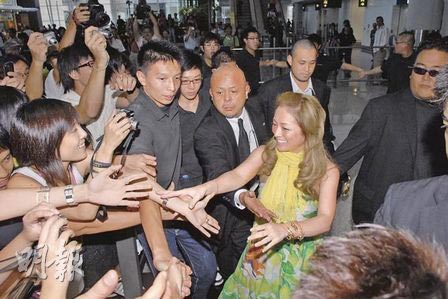據(jù)香港《明報(bào)》報(bào)道,濱崎步昨午1時(shí)30分自日本抵港,一身古銅色皮膚的她穿著低胸綠色長(zhǎng)裙,圍著黃色絲巾,見到半百歌迷迎接心情大好。香港唱片公司聘請(qǐng)30名保安護(hù)送,她本身日本貼身保安亦有6、7名。