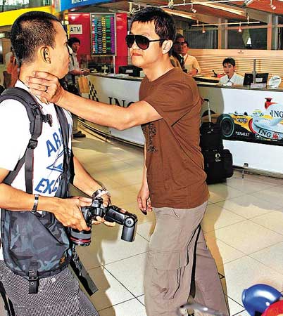香港媒體今日報道,李亞鵬與太太王菲、大女兒竇靖童和兩歲兔唇幼女李嫣前日從不丹飛往泰國,抵曼谷機場時,由于李亞鵬不滿一名《忽然1周》男攝影記者近距拍攝李嫣,突然大發(fā)雷霆打該男攝記、一名《忽周》女記者和一名《明報周刊》男記者!逗鲋堋酚浾邎蠓Q受傷,在當?shù)貓缶笾,晚上李亞鵬由王菲經(jīng)理人陳家瑛陪同到曼谷機場警局協(xié)助調查。