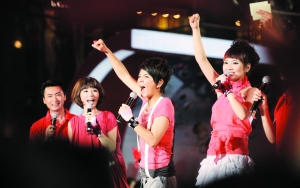 前日是北京奧運(yùn)開賽首日,陳燮霞和龐偉分別在女子舉重48公斤級和男子十米氣手槍決賽中奪得金牌。為此,可口可樂昨晚在世貿(mào)天街廣場舉行慶祝中國首日奪金的儀式,成龍、S.H.E都出席并與市民一起分享了喜悅心情。當(dāng)大屏幕上回放陳燮霞奪金的瞬間時,S.H.E三人忍不住在臺上歡呼雀躍?赡苁切那樘^激動,三人現(xiàn)場演唱第一曲《中國話》時,竟然有點走調(diào)。