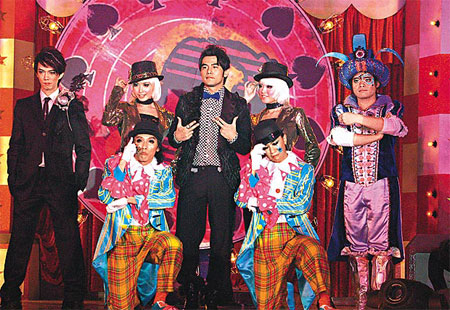 周杰倫在一班小丑造型的舞者簇?fù)硐鲁鰣?chǎng)。