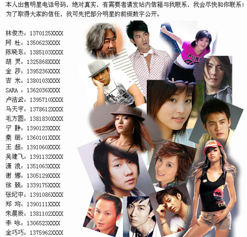 近日,原某國際唱片公司員工,年僅19歲的知名宣傳cirry(陳琪)電話遭盜,手機里88名明星電話也被盜竊者公布于網(wǎng)絡(luò),被曝名單中包括林俊杰、陳曉東、金莎、胡靈、阿杜、謝娜、阿清、朱晨辰、馬天宇、吉米、好男吳建飛、快男劉洲成、好男毛方圓、超女盧潔云、秦麗、型秀王超、瀟浪、制片人張紀(jì)中、主持人李詠、袁泉、韓國藝人SARA等88名香港內(nèi)地明星電話號碼被曝光,不少明星已被多次騷擾,不得已換號碼。