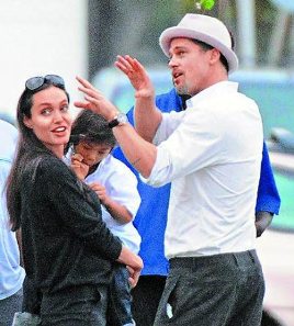 安吉麗娜·朱莉(左起)抱著吸吮拇指的派斯汀,和男友布拉德·彼特被跟拍。