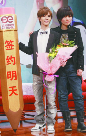 昨天的簽約儀式上,天娛當(dāng)家花旦許飛(右)獻(xiàn)花歡迎“師弟”郭敬明。