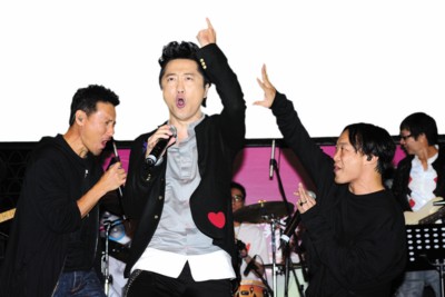 在昨日的發(fā)片會上,張學(xué)友和陳奕迅新老兩歌神不僅到場助陣,還帶來了庾澄慶最喜歡吃的巧克力和薯片,寓意他在香港“吃得開”。三人特別合唱了《愛你的只有一個我》、Rap版《愛是懷疑》以及搖滾版《吻別》。開唱前張學(xué)友打趣說:“情緒好點(diǎn)了嗎?”陳奕迅還特別提醒在座媒體“留心歌詞”。由于三人的表演非常精彩,有記者發(fā)問,庾澄慶是否考慮與張學(xué)友和陳奕迅組成一個類似“縱貫線”的樂隊,庾澄慶說:“你剛才看到的表演我們才排練了十分鐘,每一次他們都覺得哪里加一個和音會比較有亮點(diǎn),在他們百忙之下一共合作了三次。我覺得我們?nèi)齻首先應(yīng)該有作品,因?yàn)閷W(xué)友馬上就有專輯出來,Eason也正在錄音,把三個人放在一起表演有困難,如何協(xié)調(diào)才是真的,所以先有歌會比較好。我們?nèi)齻中,學(xué)友比較煽情,我比較搖滾,陳奕迅的發(fā)揮很即興,寫這首歌的人不一定是我,但是寫的人一定會很過癮。如果市場反應(yīng)不錯的話,可以跟‘貫縱線’拼一下。”