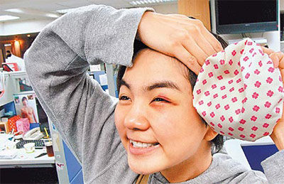 她左眼立刻腫起及嚴(yán)重瘀青,她回家后不斷冰敷,還慶幸:“只差一點(diǎn),就打到眼球,好險(xiǎn)!”樂觀的她昨進(jìn)所屬華研音樂辦公室,還大喊:“快來看團(tuán)團(tuán)圓圓,來我這里看貓熊免排隊(duì)喔!”不過她現(xiàn)在最擔(dān)心周五預(yù)定要拍廣告,目前左眼的瘀青沒把握來得及消褪,華研表示若屆時(shí)傷勢(shì)未痊愈,只好跟廠商協(xié)調(diào)延期拍攝。