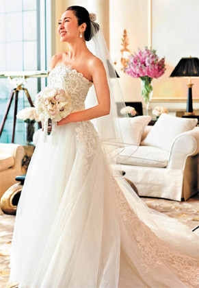 昨日黎姿透過(guò)無(wú)線發(fā)了兩款婚照,分別是一襲婚紗和一襲粉紅晚裝,雖未見丈夫馬廷強(qiáng)在旁,但黎姿笑容甜絲絲。據(jù)知這輯相是黎姿和丈夫設(shè)宴前一天提早入住酒店補(bǔ)拍的,由著名攝影師張文華操刀。