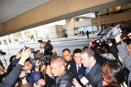 陳冠希在經(jīng)理人陪同下,抵達(dá)溫哥華高等法院應(yīng)訊,經(jīng)理人表示,原先法庭考慮陳冠希的安全,計(jì)劃安排他在停車場(chǎng)直接進(jìn)入法庭,不過經(jīng)與陳冠希商量后,決定由正門進(jìn)入,以顯示陳對(duì)此宗案件坦然面對(duì)。