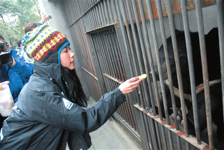 莫文蔚2004年3月成為亞洲動(dòng)物基金“拯救黑熊愛(ài)心大使”,隨后,只要她到成都,一定要抽出時(shí)間前往黑熊救護(hù)中心。這次來(lái)成都參與震后的公益慈善活動(dòng),莫文蔚昨日一大早就來(lái)到了救護(hù)中心。“寶貝兒”是2005年初莫文蔚認(rèn)養(yǎng)的一只取膽黑熊,經(jīng)過(guò)工作人員4年的精心照料,“寶貝”早已康復(fù)。當(dāng)莫文蔚來(lái)到“寶貝”的喂養(yǎng)間時(shí),“寶貝”似乎認(rèn)識(shí)恩人,一看到莫文蔚就活蹦亂跳。莫文蔚也開心不已,還把特意帶來(lái)的水果蘸上蜂蜜喂給“寶貝”(上圖)。昨日莫文蔚還看望了最新救助的12頭黑熊以及棕熊“凱撒”,一路上笑聲不斷。