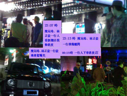 而后記者進(jìn)入酒吧。尋找陳冠希一行的身影。終于在位于舞池后方的一玻璃狀敞開(kāi)式包廂內(nèi)發(fā)現(xiàn)了陳冠希的身影。此時(shí)的陳冠希已經(jīng)脫下外套,里面是一件灰色襯衫,還有一件T-SHIRT,伴著昏暗的燈光的嘈雜的音樂(lè),和坐在身邊的林正豪開(kāi)始碰杯喝酒。而這個(gè)包廂周?chē),至少?個(gè)安全人員把守。但這樣的放松僅僅持續(xù)了不過(guò)幾分鐘,突然,一新朋友走進(jìn)包廂,陳冠希立即站立起來(lái)握手,但這一站立,立即讓鄰近包廂的兩女孩子異口同聲驚叫“啊,陳冠!,然后人群中開(kāi)始涌動(dòng)過(guò)來(lái),眼看身份暴露,陳冠希一行立即起身在保安的簇?fù)硐峦蝗幌Я恕?/p>