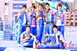 昨日,人氣組合Super Junior-M在中國香港出席代言百事簽約儀式(見上圖),在形式上搞搞新意思坐著推土機(jī)出場,散發(fā)著陽光氣息,身為Super Junior-M隊(duì)長的韓庚更表示,希望可以借現(xiàn)在專輯發(fā)布、人氣上升的時(shí)機(jī),向影視方面進(jìn)軍。