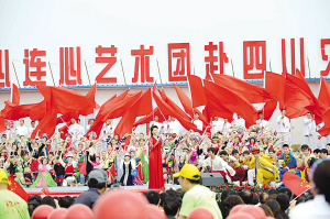 前天上午,為了讓更多的災(zāi)區(qū)人民以及援建志愿者看到演出,“心連心”藝術(shù)團專門派出兩支小分隊赴德陽東汽新址以及北川擂鼓鎮(zhèn)舉行分會場表演,而昨天上午,主會場的演出則在綿竹上演,上萬觀眾觀看了演出。而央視著名主持人趙忠祥、畢福劍、徐俐、韓喬生、李瑞英、王小丫、鞠萍、馬東、朱迅等名嘴擔(dān)綱主持并反串了精彩節(jié)目。孫悅、韓磊、湯燦、張邁、陳小濤等近百位明星為災(zāi)區(qū)群眾獻藝。這樣的陣容的確如之前報道的一樣,“超過春晚”。許多災(zāi)區(qū)群眾感動地說:“央視心連心藝術(shù)團,在地震周年到災(zāi)區(qū)演出,確實把溫暖送到了我們心里,讓我們對重建家園更有信心”。