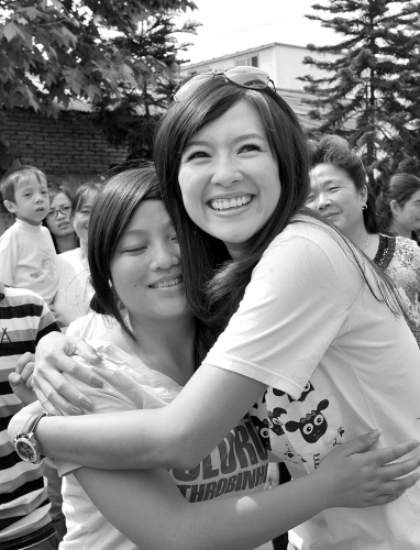 這時,一個孩子擠近章子怡身邊。章子怡問道:“小朋友,你叫什么名字?”旁邊的吳院長立即說:“子怡,這孩子有先天性聾啞,耳朵聽不見!闭伦逾p眼閃出一絲淚花,她伸出雙手立即將孩子緊緊擁抱。之后,她拿出了精美的筆記簿禮物,一一送到孩子們手上。