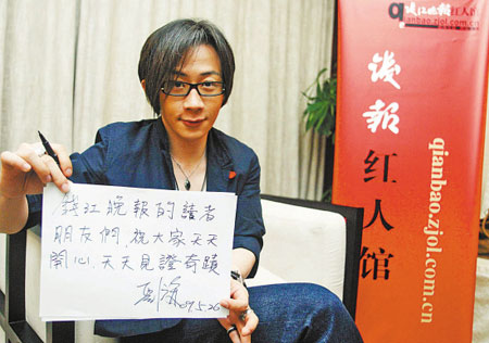 2009年兩大春晚紅人之一——?jiǎng)⒅t,來到錢報(bào)紅人館做客了。坐在本報(bào)記者面前的沙發(fā)上,遭遇到“近景魔術(shù)是否將如同選秀一樣走向死亡”這樣并不令人愉快的話題,劉謙連眉毛也不跳一下,依舊保持著他典型的職業(yè)化的笑容,胸有成竹地拆招:“就算選秀死了,不代表將來人們就不唱歌了,魔術(shù)同樣是不可缺少的。其實(shí),我根本不擔(dān)心這個(gè)問題。”