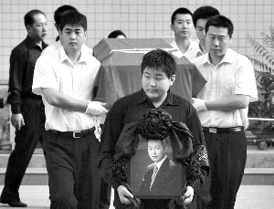 追悼會(huì)現(xiàn)場(chǎng),水晶玻璃棺材四周布置著上萬(wàn)朵百合花、白玫瑰花,靈堂肅穆安靜,羅京身著黑色西服、彩色領(lǐng)帶,遺態(tài)安詳。羅京妻子、愛子,以及所有親屬排成一列,陪伴羅京走完最后一程。羅京的妻子面容憔悴,低頭不語(yǔ)。靈堂外挽聯(lián)橫批“沉痛悼念羅京同志”。由于現(xiàn)場(chǎng)前來的群眾太多,工作人員不得不細(xì)心地提醒大家,“咱們就不鞠躬了,看一看羅老師就走,謝謝大家配合。”