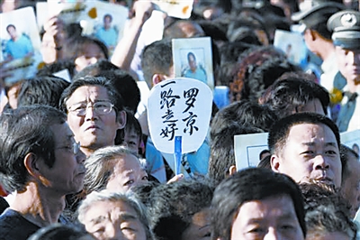 清晨開始,來自各方的群眾自發(fā)前往八寶山悼念羅京,長達百米的隊伍蜿蜒而至公墓大門之外,數(shù)百只花圈擺滿靈堂兩側(cè),寄托著各方人士對羅京的緬懷之情。有白發(fā)蒼蒼步履蹣跚的80歲老人,有在父母帶領下、牙牙學語的孩子,有從小與羅京一起學習的同學,有羅京高中母校的代表,有曾經(jīng)受過他指導的實習生,還有專程從美國趕來送羅京最后一程的校友,很多人憶起與羅京生前的點滴黯然淚下。近萬人的哀悼隊伍井然有序,大家手持白菊,每七人一組向羅京遺體三鞠躬,為“國嘴”祈禱送行。
