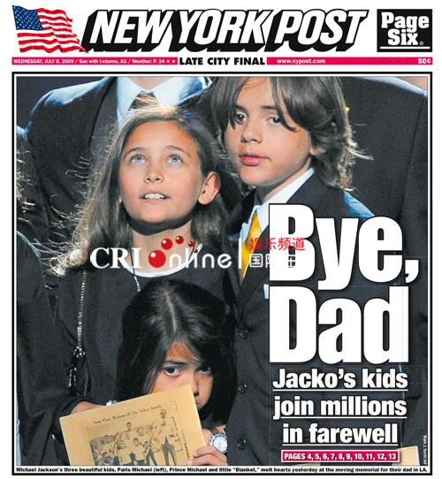 2009年7月9日訊,洛杉磯,當(dāng)?shù)貢r間7月7日,流行音樂之王邁克爾·杰克遜(Michael Jackson)的公眾悼念儀式在美國洛杉磯的斯臺普斯體育中心舉行。當(dāng)?shù)貢r間7月8日,《紐約郵報》把杰克遜三遺孤的合影當(dāng)做封面,孩子們泛紅的眼圈,哀傷的神情令人心酸。