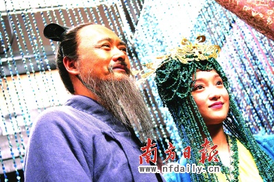 昨天下午5時左右,在涿州影視城戰(zhàn)國城內的一座大殿里,“子見南子”的戲正式上演。幽暗的大廳里擺設著8座戰(zhàn)國時常見的犧尊造型的琉璃紗燈,褐色的紗帳從梁上垂下。而由奚仲文打造的演員服裝更是讓人眼前一亮:扮演孔子的周潤發(fā)身穿青灰色麻布長袍,頭戴同顏色的儒士巾,看起來極為樸實。而周迅扮演的南子則一身水藍色的長裙,顯得雍容華貴。周迅頭頂?shù)慕鹕P冠和同樣水藍色的頭飾,據(jù)說是由松綠石串成,因此非常沉重。在第一次試戴的時候,周迅甚至抬不起頭來, 需要有人在后面幫忙才能正常行走。
