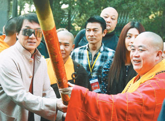 中新網(wǎng)10月23日電 劉德華將在新片《新少林寺》中拜成龍為師學(xué)功夫!昨天河南少林寺的寧?kù)o被打破,宣揚(yáng)武術(shù)精神的《新少林寺》開(kāi)鏡,成龍、劉德華、謝霆鋒、范冰冰、吳京齊聚少林寺,現(xiàn)場(chǎng)貴賓、武校學(xué)生見(jiàn)到巨星全變粉絲,拚命圍上前來(lái),場(chǎng)面一度失控,成龍則發(fā)揮大哥本色指揮現(xiàn)場(chǎng),呼吁大家維持秩序。