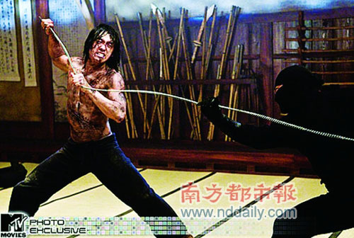 在《極速賽車手》中只是簡單客串,《忍者刺客》才是Rain主演的第一部好萊塢影片。首次挑起大梁,R ain“拼死拼活”。據(jù)他介紹,整部電影中九成以上的危險動作都是他親自上陣,“每天都拿著真正鋒利的刀在拍攝,8個月下來沒有毀容實在是萬幸。每天都很‘痛’很‘苦’,就差骨折了,天天都是青一塊紫一塊!睆膭≌丈线可以看到他為角色練就的一身肌肉。