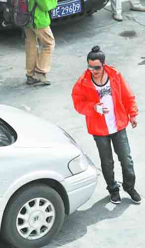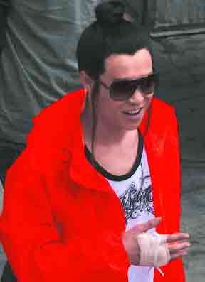 小沈陽穿著一件鮮亮的橙色外套,里面是一件隨意的白色T恤,臉上已經(jīng)化好妝,戴著墨鏡,而不是大家常見的黑框眼鏡,乍一看還真有點認不出來。小沈陽的古裝頭套已經(jīng)戴好,只是一個簡單朝上梳的發(fā)髻,不過鬢角兩側還特地留了兩縷長長的頭發(fā)。記者一眼就發(fā)現(xiàn),小沈陽的右手不自然地舉在小腹前,還用白色的紗布進行了包扎,肯定是受傷了。不過小沈陽的心情看上去好極了,他先是哼歌,后來見記者追問拍戲感受,他便取下墨鏡,反問記者是哪里人,不過面對“第一次和張導拍戲的感覺怎么樣”的問題,小沈陽只是微笑,并不回答。