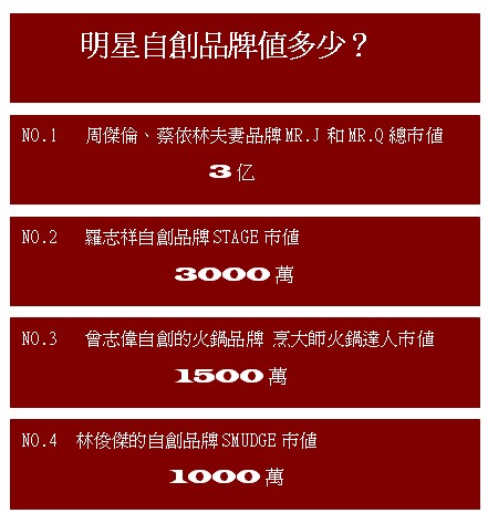 而針對這種明星以自己名義創(chuàng)立品牌的現(xiàn)象,究竟明星們的品牌價值值多少?為此記者特意采訪了知名品牌管理學者的楊教授,據(jù)楊教授解釋:由于藝人本身具有較高的社會知名度和形象的度,因此藝人創(chuàng)意品牌的價值起點都會比普通人高出好幾倍,因此藝人的知名度和形象度與其創(chuàng)立的品牌價值是密切相關(guān),從某種意義上成正比關(guān)系,而對娛樂圈的一些藝人及其自創(chuàng)品牌,楊教授也給出一個系統(tǒng)的市值評估,如羅志祥的自創(chuàng)品牌STAGE市值 3000萬,林俊杰的自創(chuàng)品牌SMUDGE市值1000萬,曾志偉自創(chuàng)的火鍋品牌烹大師火鍋達人市值1500萬,而周杰倫與蔡依林這次合伙經(jīng)營的MR.J和MR.Q市值,楊教授也給出了一個值得參考的數(shù)據(jù)3億。