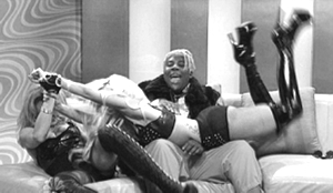 上周六播出最新一集SNL,年過半百的娜姐跟比她年輕一半的Lady Gaga,兩人穿著皮制內衣及長靴勁歌熱舞,娜姐先是挑釁地說:“跳得什么爛鬼迪斯科啊。”Lady Gaga回嘴:“麥當娜,我比你更辣!蹦冉悴桓适救醯卣f:“我比你高,Lady Gaga這什么名字啊,聽起來像嬰兒食品!彪S后兩人扭打,主持人凱南·湯普森唯有出來調停,最后Lady Gaga干脆整個人飛撲過去,跨過凱南直接打娜姐。凱南正在發(fā)愁之際,兩位“瘋后”突然和好了,而且還當眾親嘴。事后兩人表示互相當對方為偶像,感情好得很。泰漁