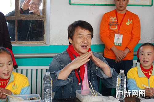 臨近午飯時分,成龍與十幾名小學(xué)童每人領(lǐng)到了一盒香菇炒油菜和白米飯的盒飯,在一間簡陋的教室里津津有味地吃了起來。雖然是頭一次與國際巨星成龍在一起吃飯,可這些鄉(xiāng)村娃娃卻一點也不怯場,好奇心驅(qū)使他們左一個問題右一個問題問個不完。而成龍卻面帶笑容地邊吃邊聊,將他的成長經(jīng)歷和成功經(jīng)驗?zāi)托牡匾灰唤獯。眾學(xué)童聽完后,紛紛夸“成龍叔叔好棒。