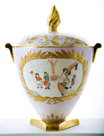 李亞鵬在2009年度嫣然天使基金慈善晚宴新聞發(fā)布會(huì)上表示,晚宴現(xiàn)場(chǎng)拍賣所需的藝術(shù)品已基本到位。其中,最吸引眼球的拍品無(wú)疑就是由兩位“潛力藝術(shù)家”竇靖童、李嫣聯(lián)手設(shè)計(jì)的Wedgwood-Trophy Vase(瑋致活—?jiǎng)倮?精致骨瓷。據(jù)悉,Wedgwood是英國(guó)傳統(tǒng)陶器品牌,竇靖童、李嫣為Trophy Vase所創(chuàng)作的這一設(shè)計(jì),取材于一家人融洽相處的畫面,表現(xiàn)出小孩眼中的溫馨家庭氛圍和每個(gè)人都渴望得到的關(guān)愛。