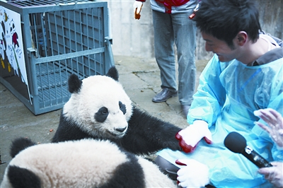 1月5日,“中國保護(hù)大熊貓研究中心熊貓愛心大使“黃曉明到雅安現(xiàn)場,替自己的一雙“兒女”送行。由他百萬認(rèn)養(yǎng)的地震后出生的全球首對雙胞胎大熊貓“平平”、“安安”這次就將以“哥哥”、“姐姐”的身份帶領(lǐng)另外八只熊貓遠(yuǎn)赴上海世博。“平平”似乎一眼就認(rèn)出了“爸爸”,邊吃著早餐,另一只手很自然的就搭在了黃曉明的腿上。 記者 黃麗娟