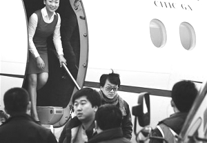 下午3:20,成龍的飛機(jī)降落在機(jī)場。幾名工作人員先行下機(jī),警覺地四處環(huán)顧,一眼就看到了攝影記者手中的相機(jī),立刻上前阻止:“成龍大哥沒有化妝,頭發(fā)很亂,還有白頭發(fā),你不能拍!