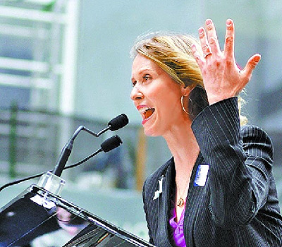 辛西亞3年前罹患乳癌,女友不離不棄陪她對(duì)抗病魔。她前天在記者會(huì)上公布訂婚喜訊,她說:“如果同志婚姻在紐約合法,我們一定會(huì)結(jié)婚。我不想假裝結(jié)婚,我們要真正的、合法的,能夠得到州政府認(rèn)可的婚姻!毙廖鱽喌暮糜选队鞘小分械摹跋木G蒂”克里斯廷·戴維斯,前天現(xiàn)身力挺她。